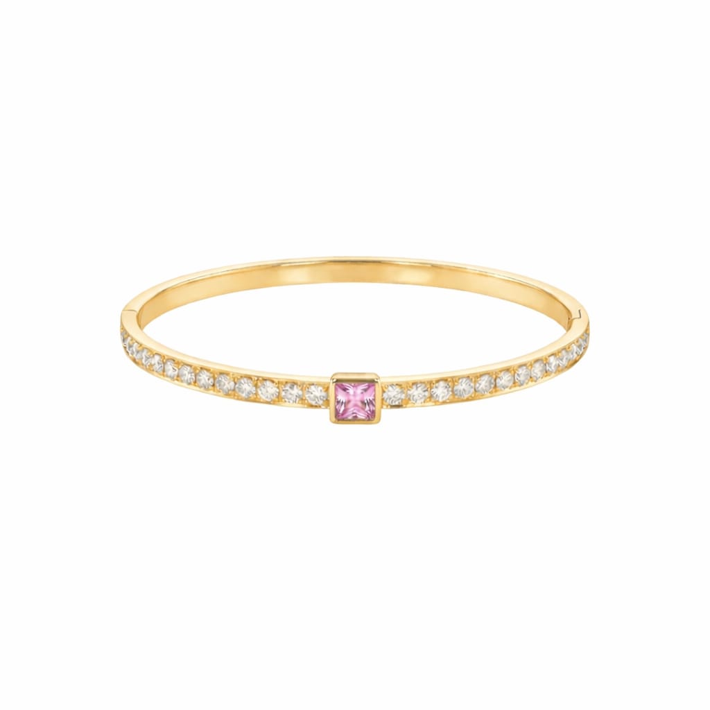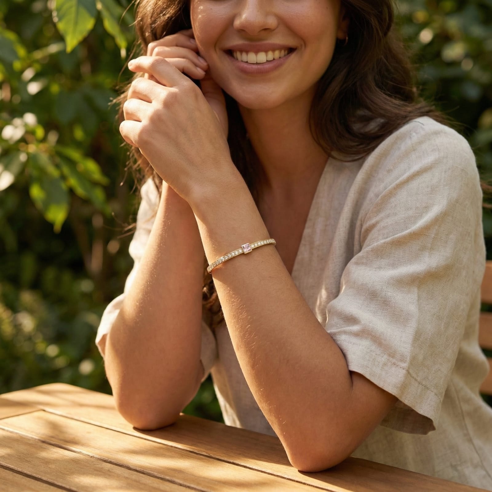 Pink Rectangle Crown Bracelet Elevate your wrist with this striking statement piece, featuring a geometric pink rectangle stone set within an ornate crown-inspired frame. The modern-luxe design balances bold architectural lines with refined detailing, making it equally suited for layering with complementary pieces or wearing as a standalone focal point. Crafted with premium materials and meticulous attention to finish, this bracelet delivers the understated sophistication that defines contemporary fine jewelry.