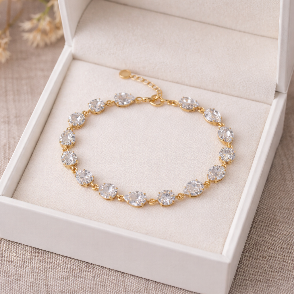 Crystal Chain Bracelet- TDC Elevate your wrist with this refined crystal chain bracelet, where precision-cut crystals meet contemporary metalwork. Each link showcases brilliant faceting that catches light with every movement, creating a sophisticated play of sparkle throughout the day. The secure chain construction ensures durability without compromising elegance, making it equally suited for everyday wear or special occasions. A versatile piece that bridges minimalist and statement styling.