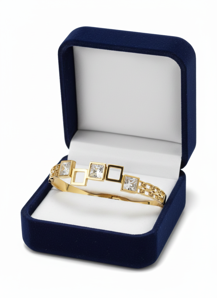 Elevate your everyday elegance with this cubic stud bangle, a masterpiece of refined minimalism. Crafted with precision-cut cubic zirconia studs set into a polished metal band, this piece delivers sophisticated sparkle without overwhelming the wrist. The geometric studs catch light beautifully, making it ideal for layering or wearing solo. Perfect for those who appreciate understated luxury and timeless design, this bangle transitions seamlessly from office to evening wear.