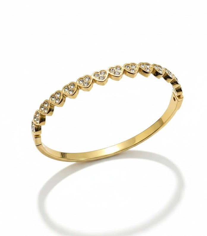 Delicate heart charms cascade gracefully across this layered bracelet, creating an elegant composition that balances sophistication with romantic appeal. Crafted with precision, each layer is thoughtfully spaced to showcase intricate detailing while maintaining a refined silhouette. The stacked design offers versatility—wear it solo for understated elegance or stack with complementary pieces for a curated, editorial look. Perfect for those who appreciate jewellery that speaks to both craftsmanship and meaningful sentiment, this bracelet transitions seamlessly from everyday wear to special occasions.