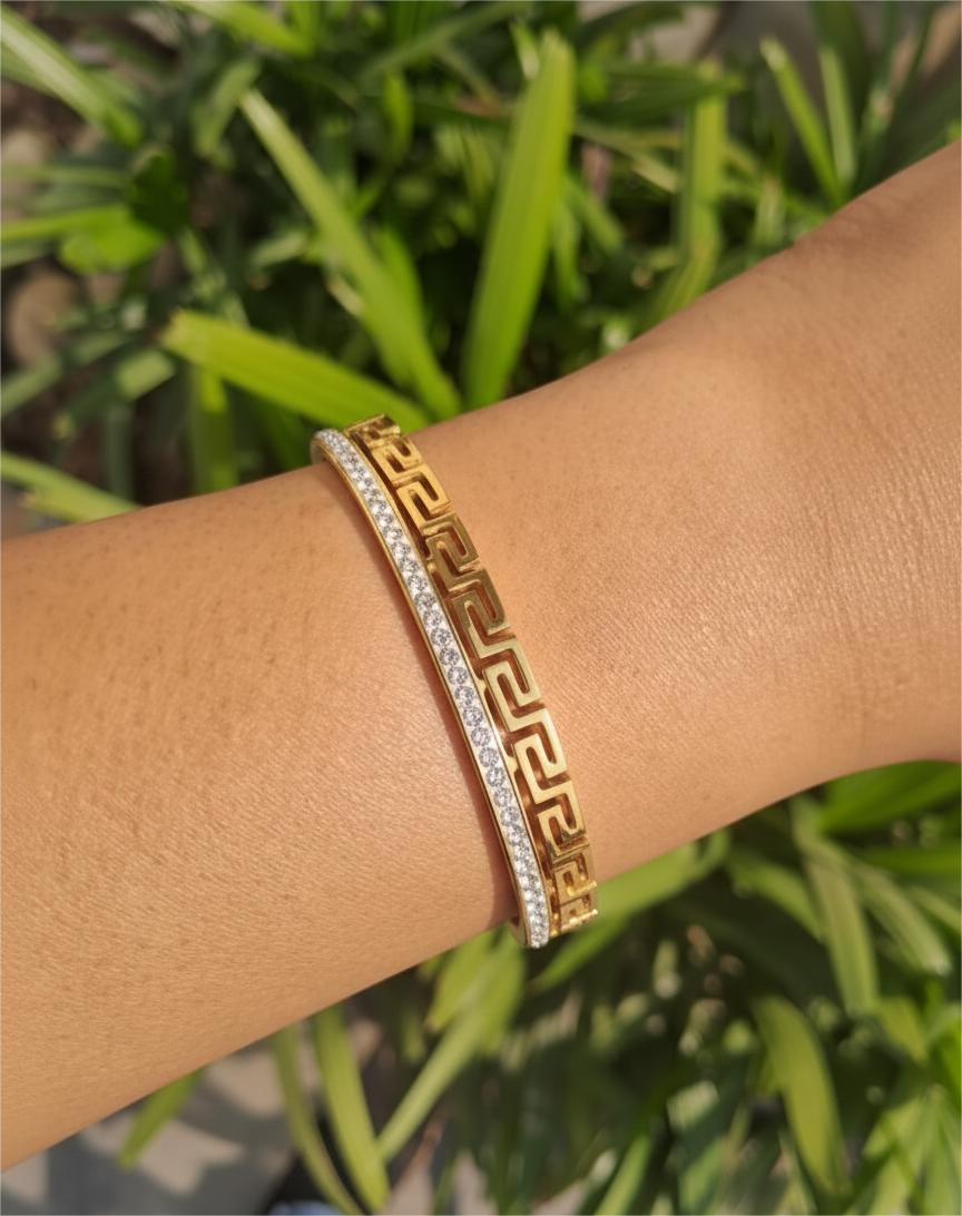 Elevate your wrist with the Maze Line Stud Bracelet, a sophisticated piece that merges contemporary design with timeless appeal. Featuring an intricate maze-inspired linear pattern adorned with carefully placed studs, this bracelet delivers understated luxury with architectural precision. The studded detailing catches light beautifully, creating subtle dimension throughout the day. Perfect for layering or wearing solo, it transitions seamlessly from casual to formal occasions. Crafted with attention to detail, this statement accessory complements both minimalist and bold personal styles, making it an essential addition to any jewelry collection.
