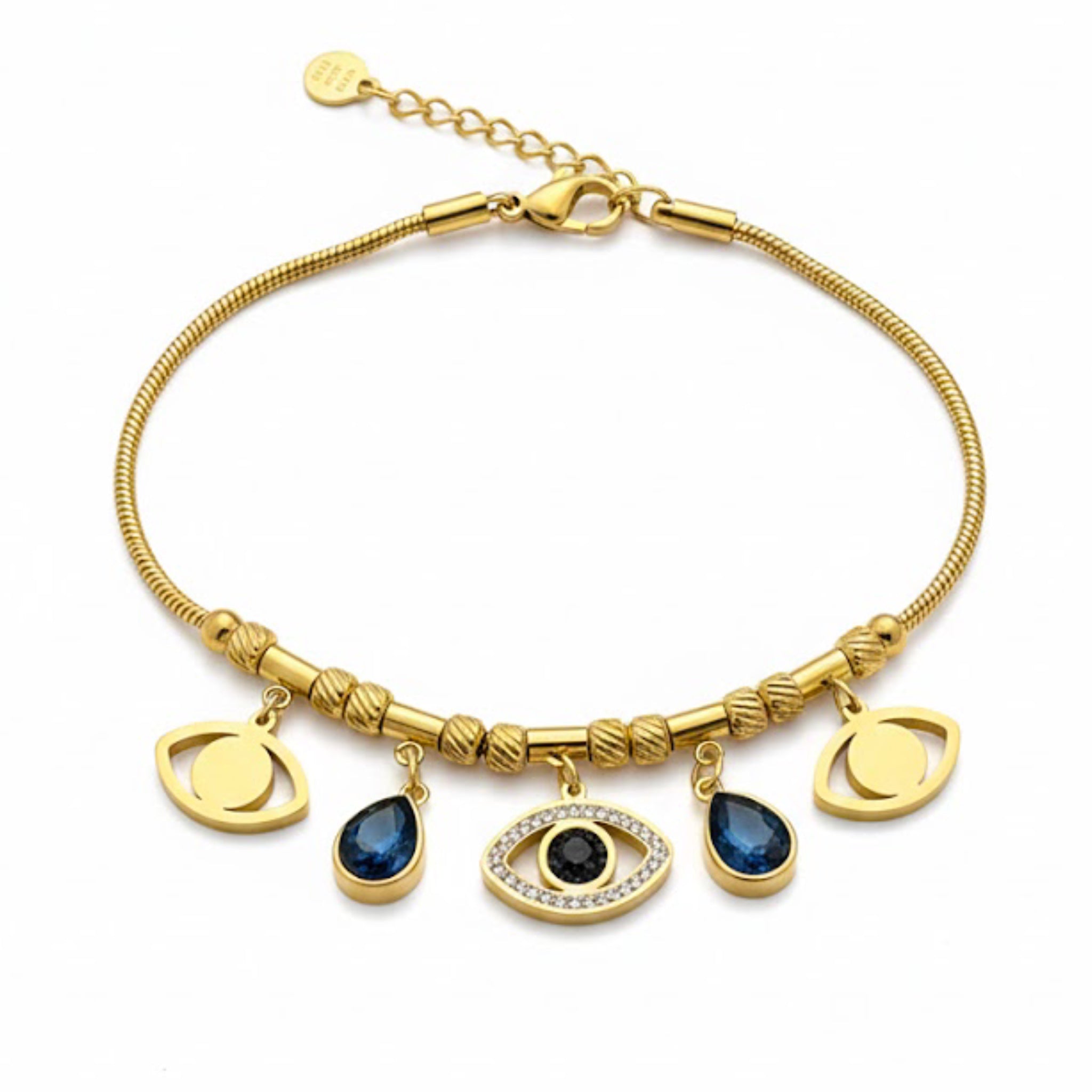 Nova Eye Bracelet Crafted with precision, the Nova Eye Bracelet merges contemporary design with timeless appeal. This statement piece features an intricately detailed eye motif—a symbol of protection and awareness—rendered in premium materials that catch light beautifully. The bracelet's balanced proportions make it versatile enough for everyday wear while commanding attention as a standalone accessory. Whether layered with complementary pieces or worn solo, it elevates any ensemble with understated sophistication. An essential addition for those who appreciate jewellery that tells a story and reflects personal style with confidence.