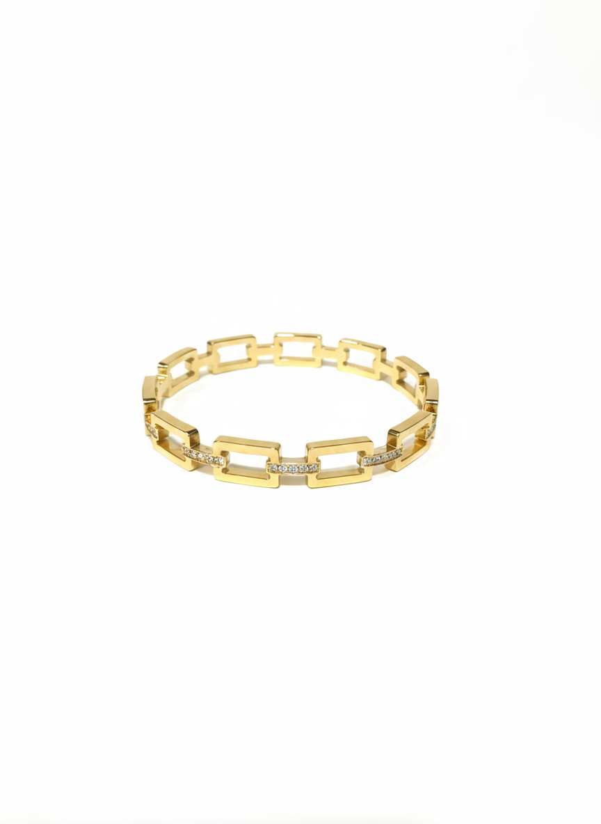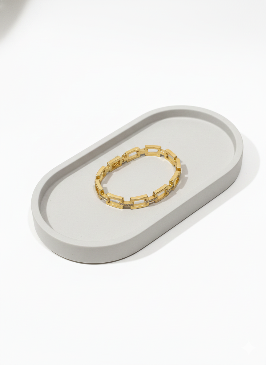 # Rouge Link Bracelet Crafted with precision, this link bracelet combines architectural geometry with refined elegance. Each segment interlocks seamlessly, creating a structured yet fluid silhouette that transitions effortlessly from day to evening wear. The bold rouge tone adds warmth and sophistication, while the articulated design ensures comfortable movement on the wrist. A versatile statement piece that anchors any jewelry collection with understated luxury and timeless appeal.