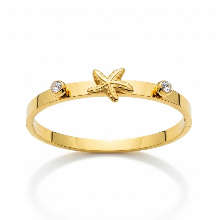 Inspired by the graceful geometry of starfish, this bracelet captures oceanic elegance in lustrous gold. Crafted with meticulous attention to detail, the sea star motif creates a striking focal point that balances sophistication with organic charm. The polished finish reflects light beautifully, making it equally suited for everyday wear or special occasions. A versatile statement piece that brings coastal-inspired luxury to any jewellery collection.