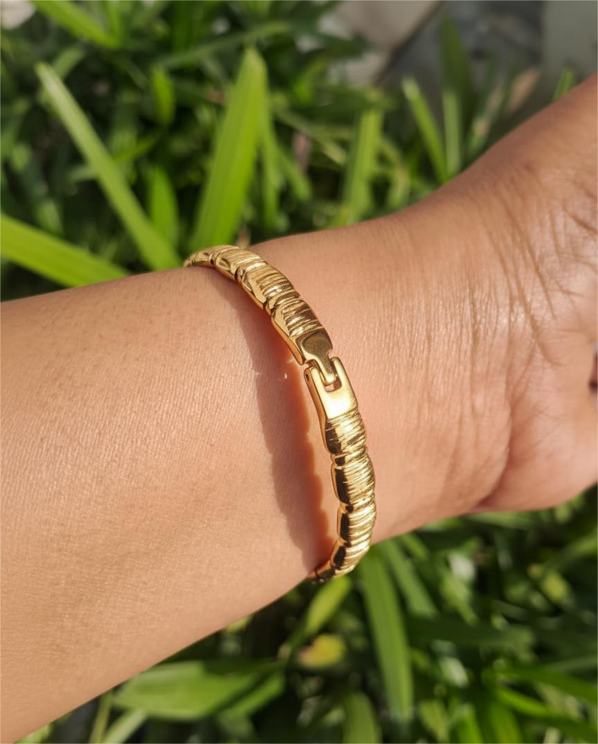 Elevate your everyday elegance with this Textured Bar Bangle, a sophisticated piece that seamlessly transitions from office to evening. Crafted with meticulous attention to detail, the textured surface catches light beautifully, adding dimension and visual interest to your wrist. The minimalist bar design offers versatility—wear it solo for understated refinement or stack it with complementary pieces for a curated, contemporary look. Perfect for those who appreciate quality craftsmanship and timeless style.