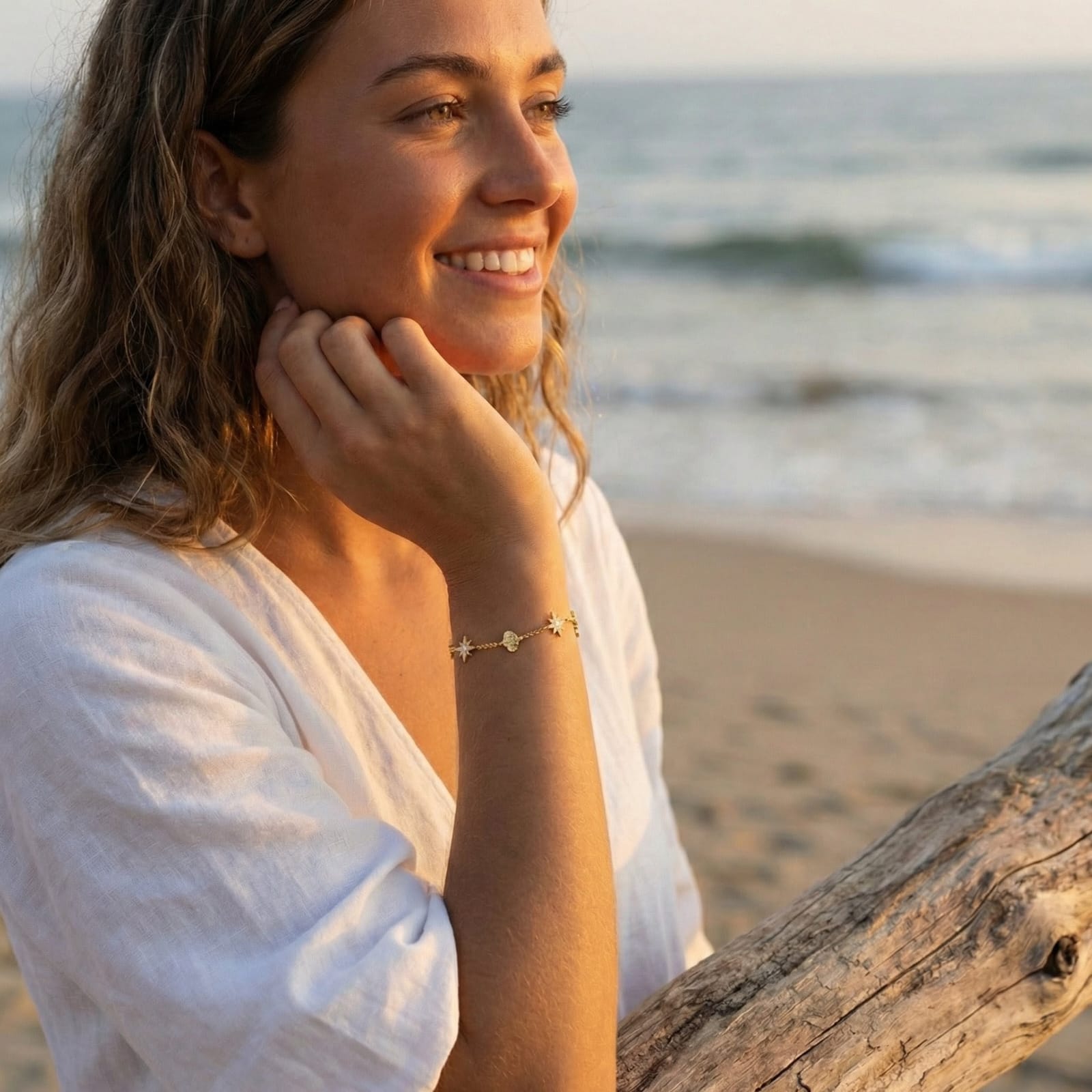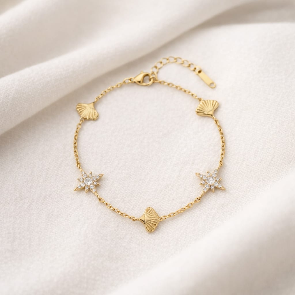 Crystal Stud Star Shell Bracelet Delicate yet striking, this bracelet combines lustrous star-shaped shells with precisely set crystal studs for understated sophistication. The interplay of natural shell texture and sparkling crystal accents creates visual depth while maintaining a refined, wearable aesthetic. Perfect as a standalone piece or layered with complementary bracelets, it brings coastal-inspired elegance to both casual and elevated occasions. Crafted for those who appreciate quality materials and thoughtful design details.