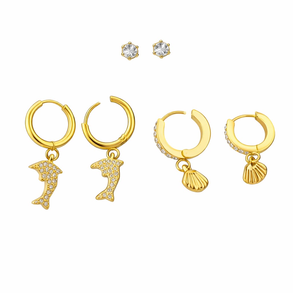 Crafted from luminous dolphin shell with delicate crystal accents, this earring set captures oceanic elegance in refined form. The iridescent shell catches light with subtle color shifts, while precisely placed crystals add sophisticated sparkle without overwhelming the design. Perfect for layering or wearing as a statement piece, these earrings balance natural beauty with polished luxury—ideal for those who appreciate jewelry that whispers rather than shouts.