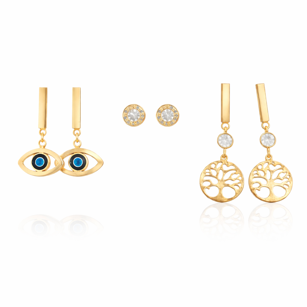 Elevate your everyday elegance with this striking Evil eye tree earing set, a modern take on timeless protective symbolism. Crafted with precision, each piece features the iconic evil eye motif paired with delicate tree detailing, creating a sophisticated balance between spiritual significance and contemporary design. The set offers versatile styling options for layered looks or standalone wear, making it an essential addition to any curated jewelry collection. Perfect for those who appreciate meaningful accessories with refined aesthetics.