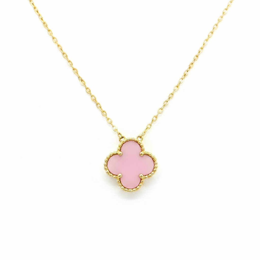 # Pink Clover Necklace Delicate four-leaf clover pendant in soft pink tones, crafted to capture understated elegance. This piece combines symbolic charm with refined aesthetics, making it ideal for layering or wearing as a standalone statement. The intricate clover design reflects meticulous craftsmanship, while the gentle pink hue complements a range of skin tones and wardrobe palettes. Perfect for those seeking meaningful jewelry that balances contemporary style with timeless appeal.