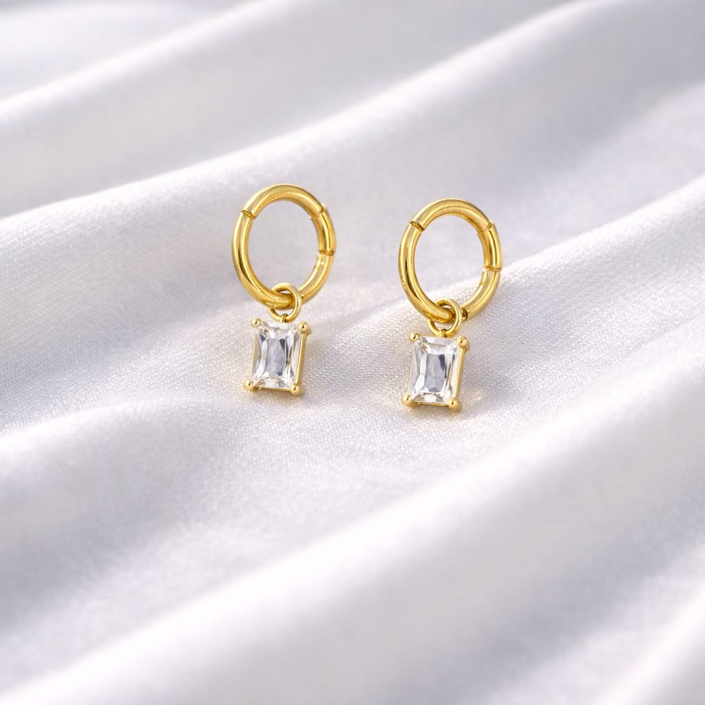 Rectangle crystal earrings that combine geometric precision with luminous sparkle. These pieces feature carefully cut rectangular crystals that catch light from every angle, creating a sophisticated play of refraction. The clean lines and balanced proportions make them versatile enough for everyday wear while maintaining an understated luxury aesthetic. Perfect for layering with other pieces or wearing as a standalone statement. Crafted with premium materials to ensure lasting brilliance and comfort throughout the day.