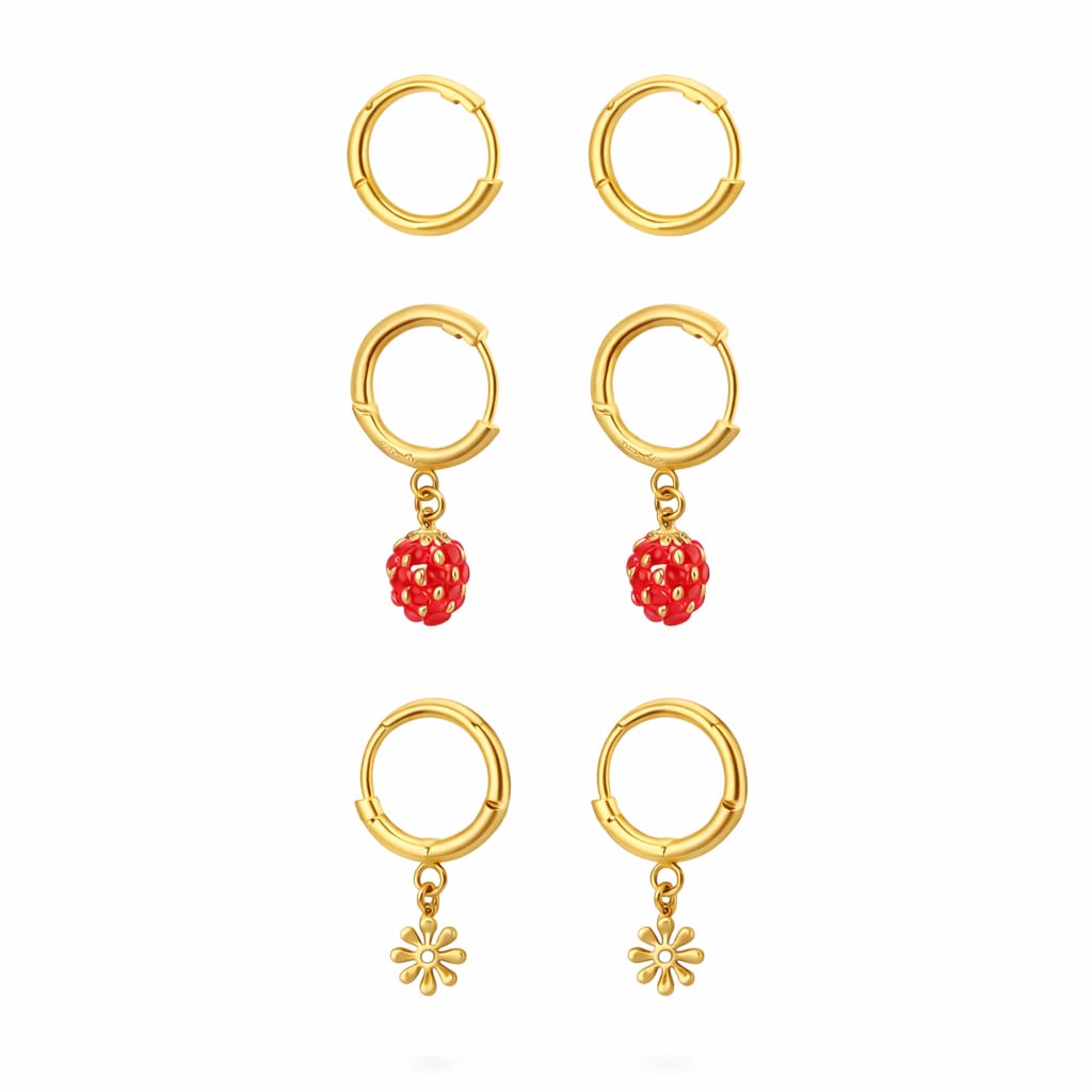 Delicate strawberry-shaped studs paired with complementary floral accents create a charming dual-earring set that captures botanical elegance. Crafted with precision detailing, each piece features vibrant enamel work and secure post closures ideal for daily wear. The thoughtful pairing allows for versatile styling—wear together for a cohesive look or mix individually with other pieces. Perfect for those who appreciate nature-inspired jewelry with refined craftsmanship and understated sophistication.