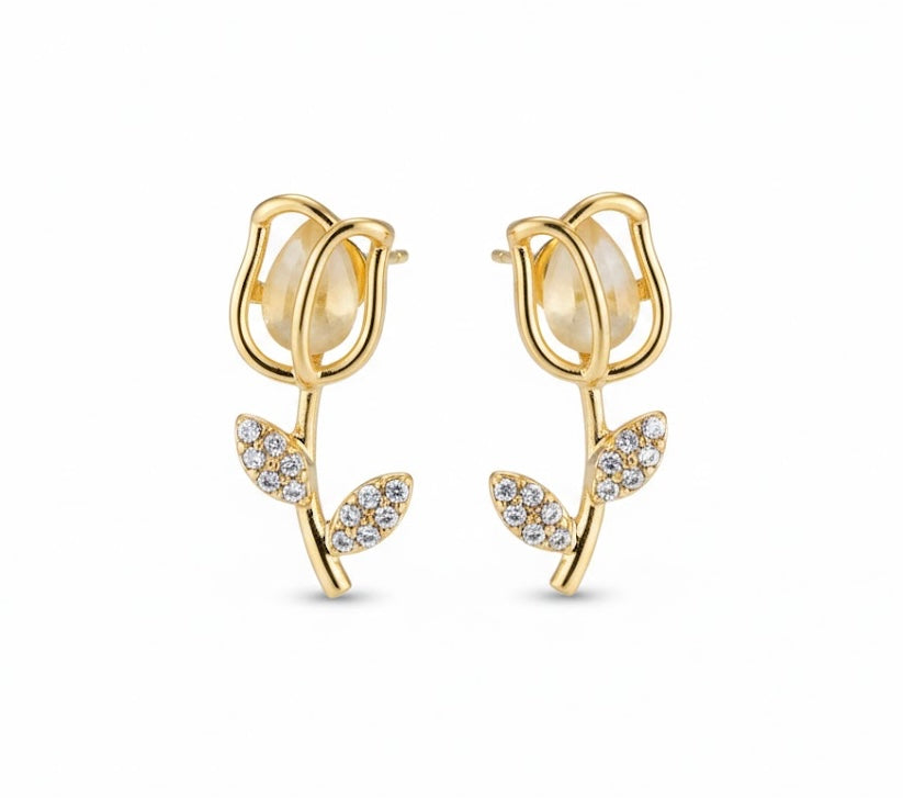 Delicate glass petals catch light with every movement, creating a mesmerizing sparkle that elevates any ensemble. These tulip-inspired earrings feature hand-crafted leaf accents in a refined design that balances botanical elegance with contemporary flair. Perfect for those who appreciate artisanal jewelry that makes a subtle yet sophisticated statement. Lightweight construction ensures all-day comfort without compromising on visual impact.