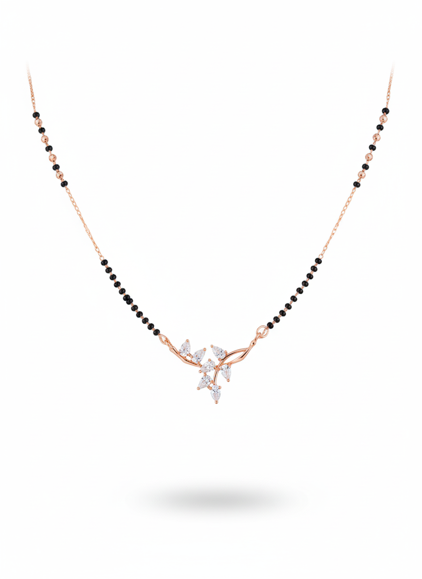 Khushi Mangalsutra is a timeless symbol of marital grace, crafted with meticulous attention to traditional design principles. This piece features an elegant interplay of lustrous beads and refined metalwork, creating a harmonious balance between classic aesthetics and contemporary sensibility. The mangalsutra's carefully proportioned design ensures comfortable everyday wear while maintaining its ceremonial significance. Each element is thoughtfully integrated to enhance the wearer's natural beauty and celebrate the sacred bond of marriage. A versatile addition to both festive occasions and daily adornment, this mangalsutra embodies the essence of enduring elegance and cultural heritage.