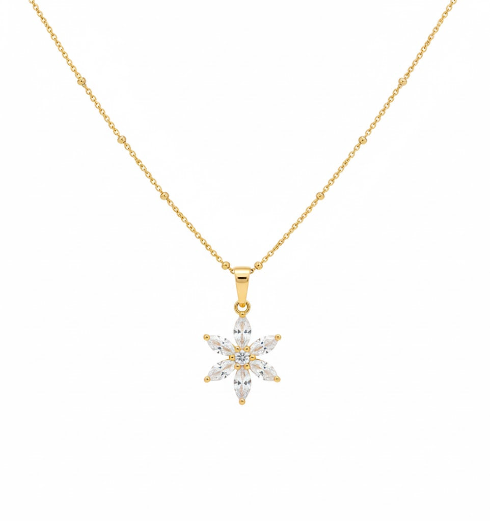 Crystal Bloomy Necklace Delicate crystalline blooms suspended in sterling silver create an ethereal centerpiece that captures light with refined sophistication. Each faceted stone is hand-selected for clarity and brilliance, offering a contemporary take on floral-inspired jewelry. The adjustable chain accommodates various necklines, while the lightweight design ensures all-day comfort without compromising presence. Perfect for layering with complementary pieces or worn as a standalone statement, this necklace bridges everyday elegance with occasion-ready polish.