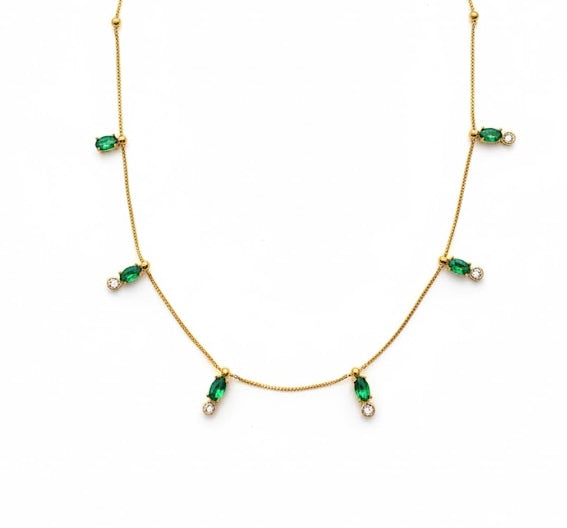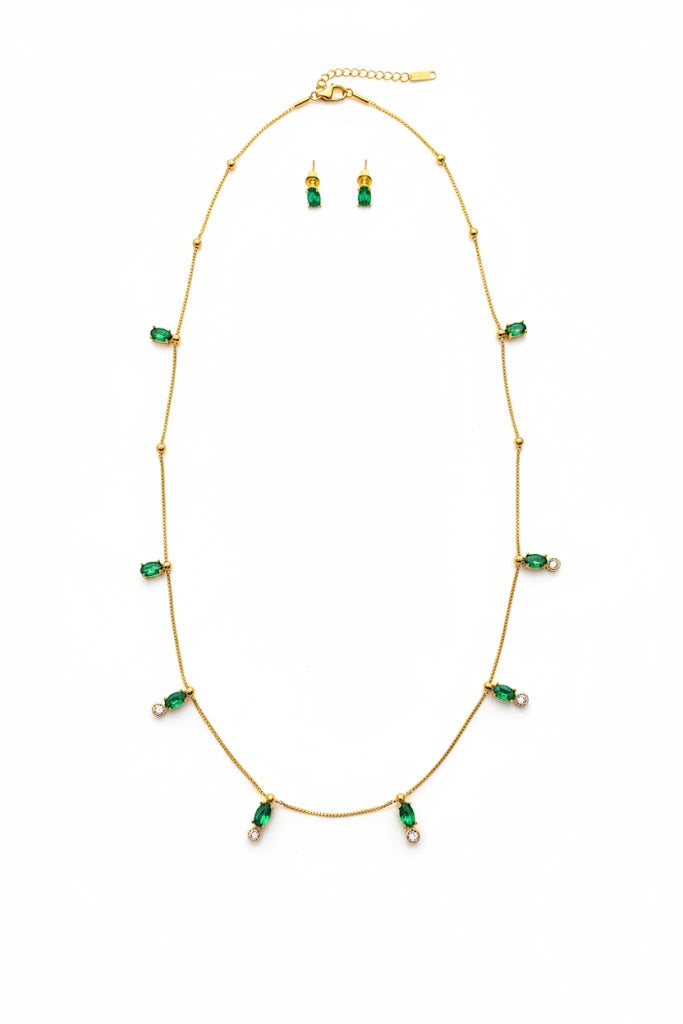 Luminous emerald ovals meet crystalline brilliance in this coordinated set. The necklace features a striking oval-cut emerald pendant suspended from a refined chain, paired with matching emerald stud earrings that echo the same sophisticated geometry. Each piece showcases the deep, verdant allure of emerald with crystal-clear faceting that captures and reflects light beautifully. Ideal for elevating everyday elegance or making a refined statement at special occasions, this set delivers cohesive luxury with versatile styling potential.