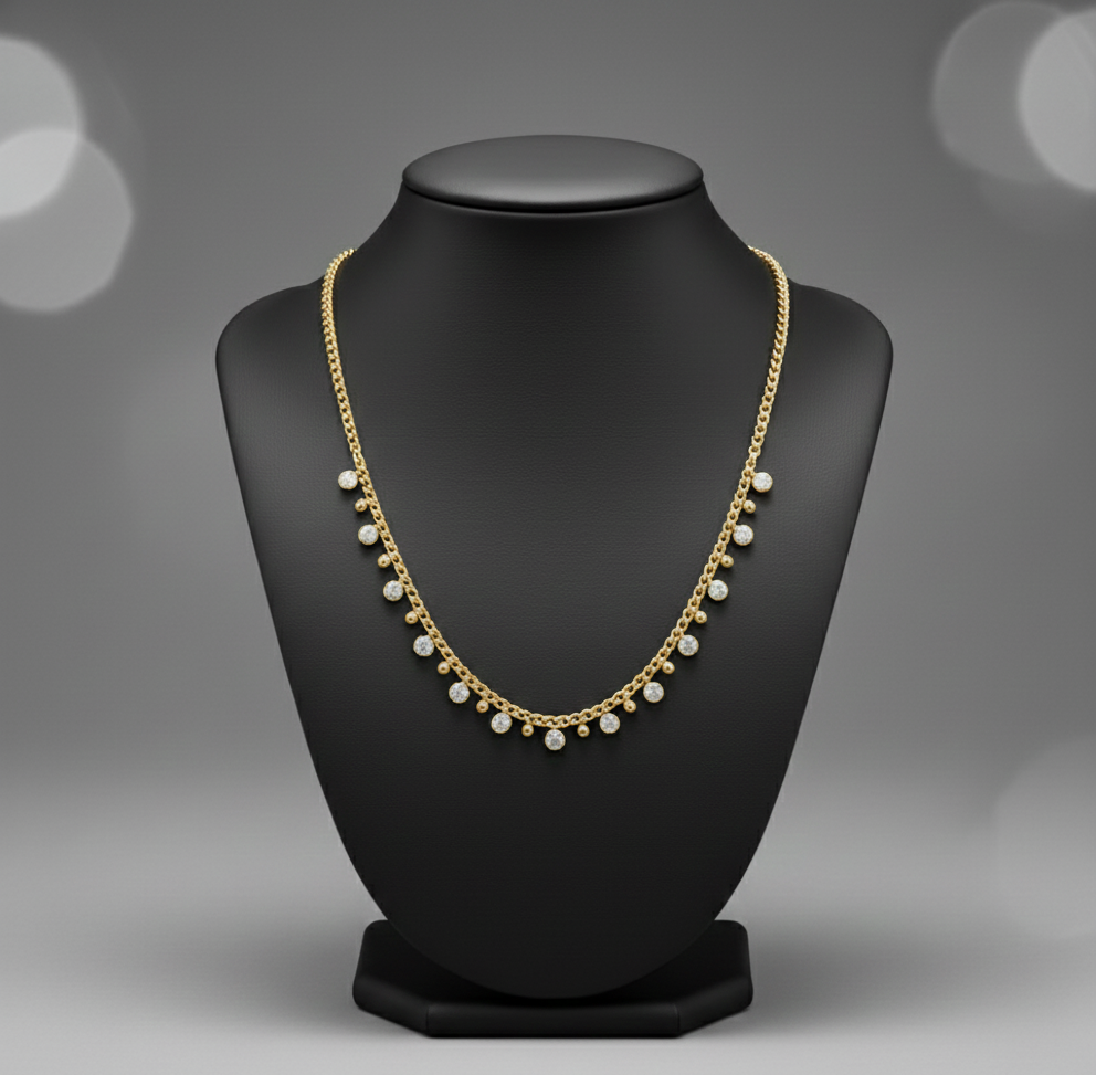 Elevate your jewelry collection with this exquisite gilt necklace, where lustrous gold plating meets radiant sparkle. Meticulously crafted to catch light from every angle, this piece combines timeless elegance with contemporary brilliance. The gilded finish ensures durability while maintaining that coveted luminous glow, making it an ideal choice for both everyday sophistication and special occasions. A versatile statement piece that seamlessly transitions from professional settings to evening wear, this necklace reflects refined taste and discerning style.