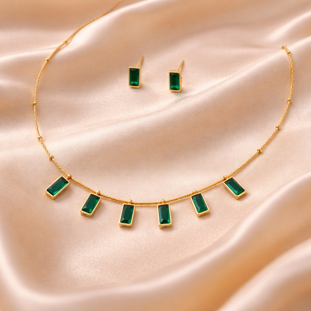 Elevate your everyday elegance with this sophisticated emerald charm necklace paired with coordinating earrings. Crafted with precision, the long-length design drapes gracefully, while vibrant emerald accents catch the light with understated luxury. The matching earring set ensures a cohesive, polished look that transitions seamlessly from day to evening. Perfect for layering or wearing solo, this versatile pairing brings timeless refinement to any wardrobe.