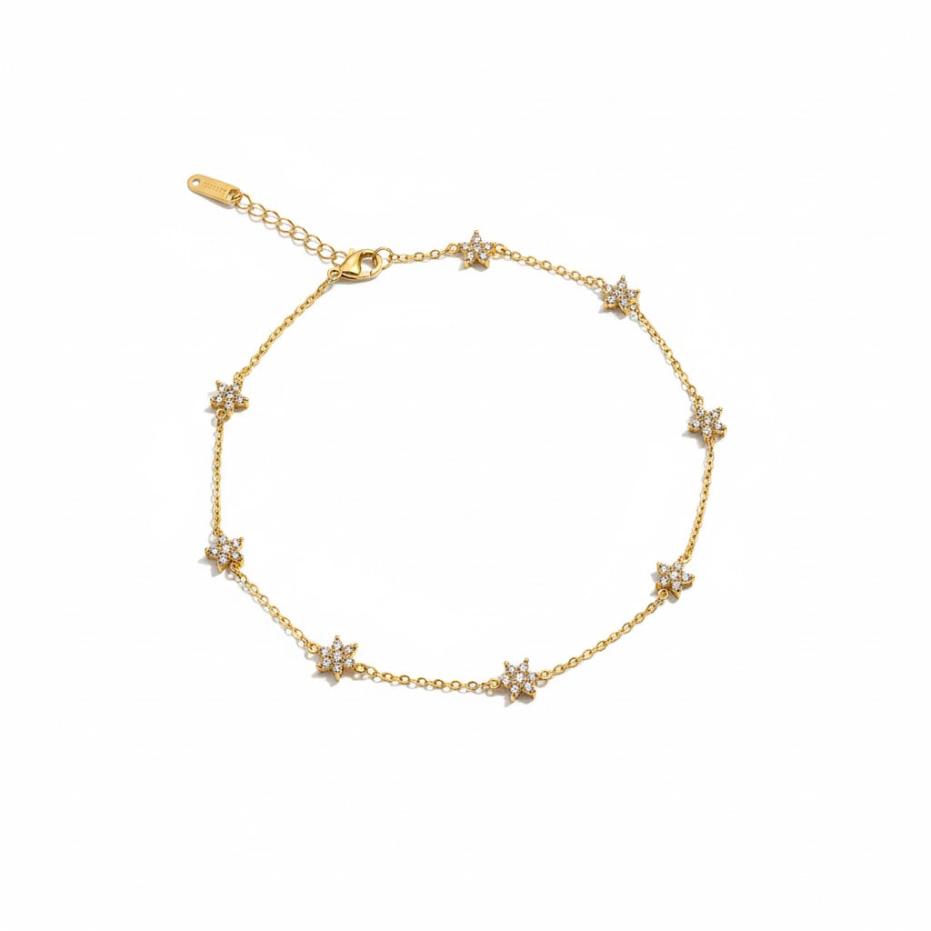 Celestial elegance meets everyday wear with this star charm stud bracelet. Crafted with precision, each star charm catches light beautifully while the stud detailing adds contemporary edge to a timeless design. Perfect for layering or wearing solo, this piece transitions seamlessly from day to evening. The secure clasp ensures durability, making it an ideal addition to your jewelry rotation or a thoughtful gift for someone who appreciates understated sophistication.