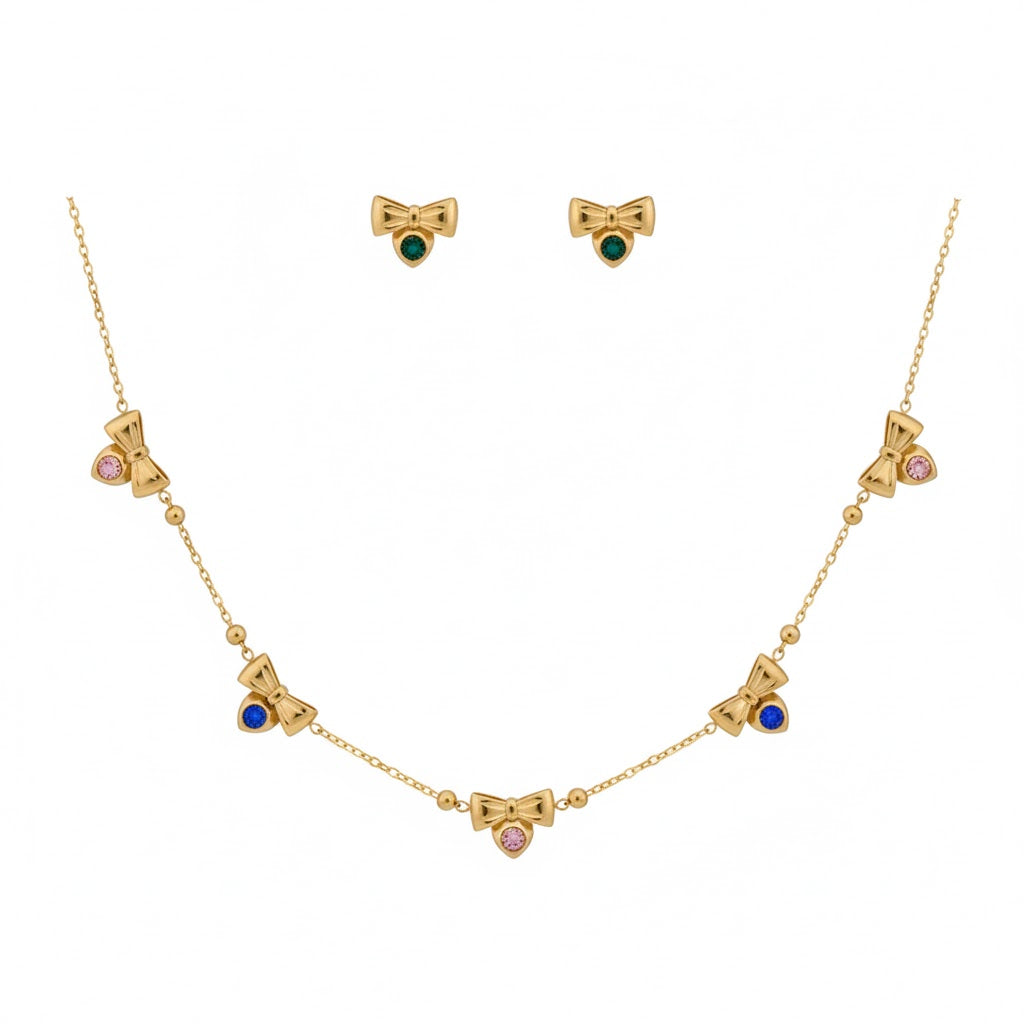 Elevate your jewelry collection with this sophisticated bow-inspired necklace paired with matching earrings. Crafted to showcase the rich, verdant beauty of emerald stones, this set combines timeless elegance with contemporary design sensibility. The graceful bow motif adds a refined touch, making it equally suited for special occasions or elevated everyday wear. Each piece is designed to complement the other, creating a cohesive, polished look that speaks to discerning taste. Perfect for those who appreciate the depth and prestige of genuine emerald gemstones.