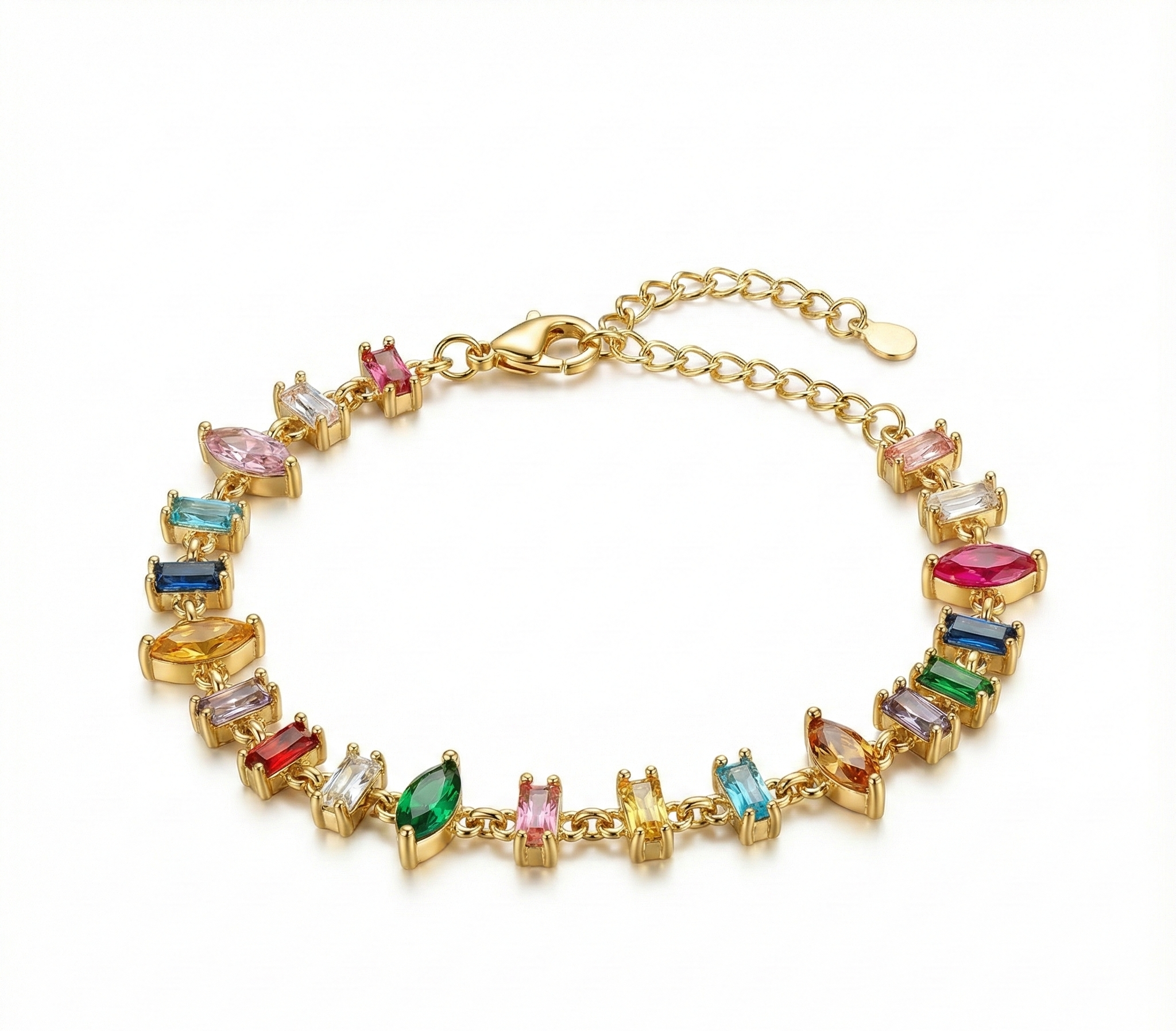 Delicate chain bracelet featuring vibrant candy-colored stones set in a refined link design. Each stone is carefully selected for its rich hue and clarity, creating a piece that transitions seamlessly from day to evening wear. The lightweight construction ensures comfortable all-day wear, while the secure clasp provides reliable closure. Perfect for layering or wearing solo, this bracelet adds a sophisticated pop of color to any jewelry collection. An investment piece that balances playful aesthetics with timeless craftsmanship.
