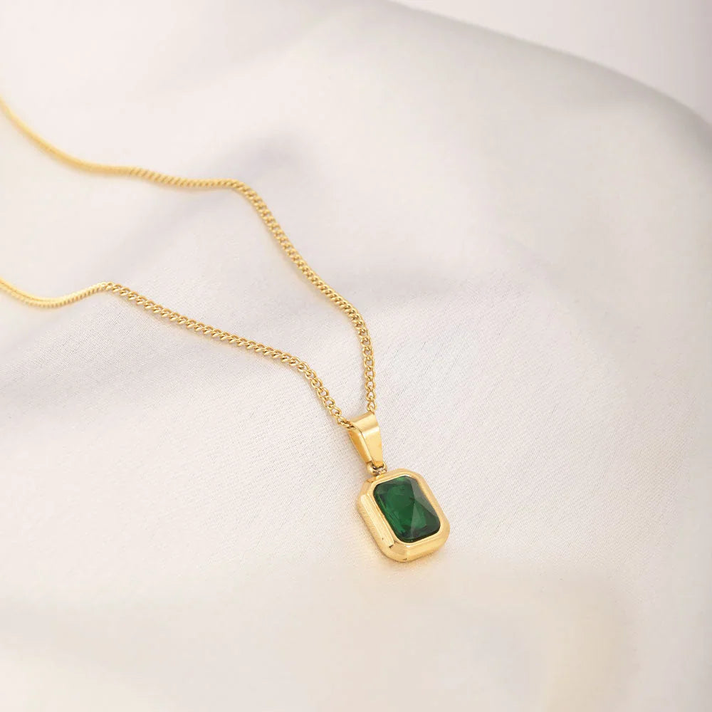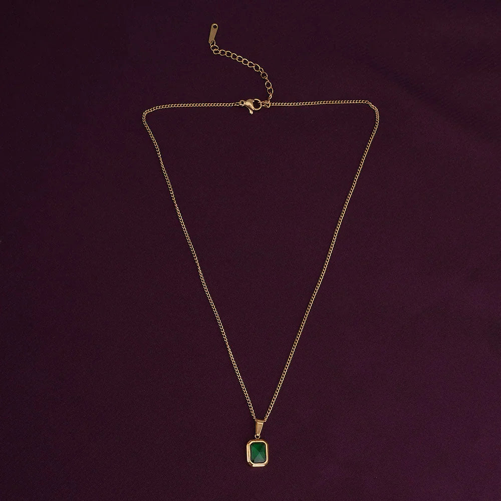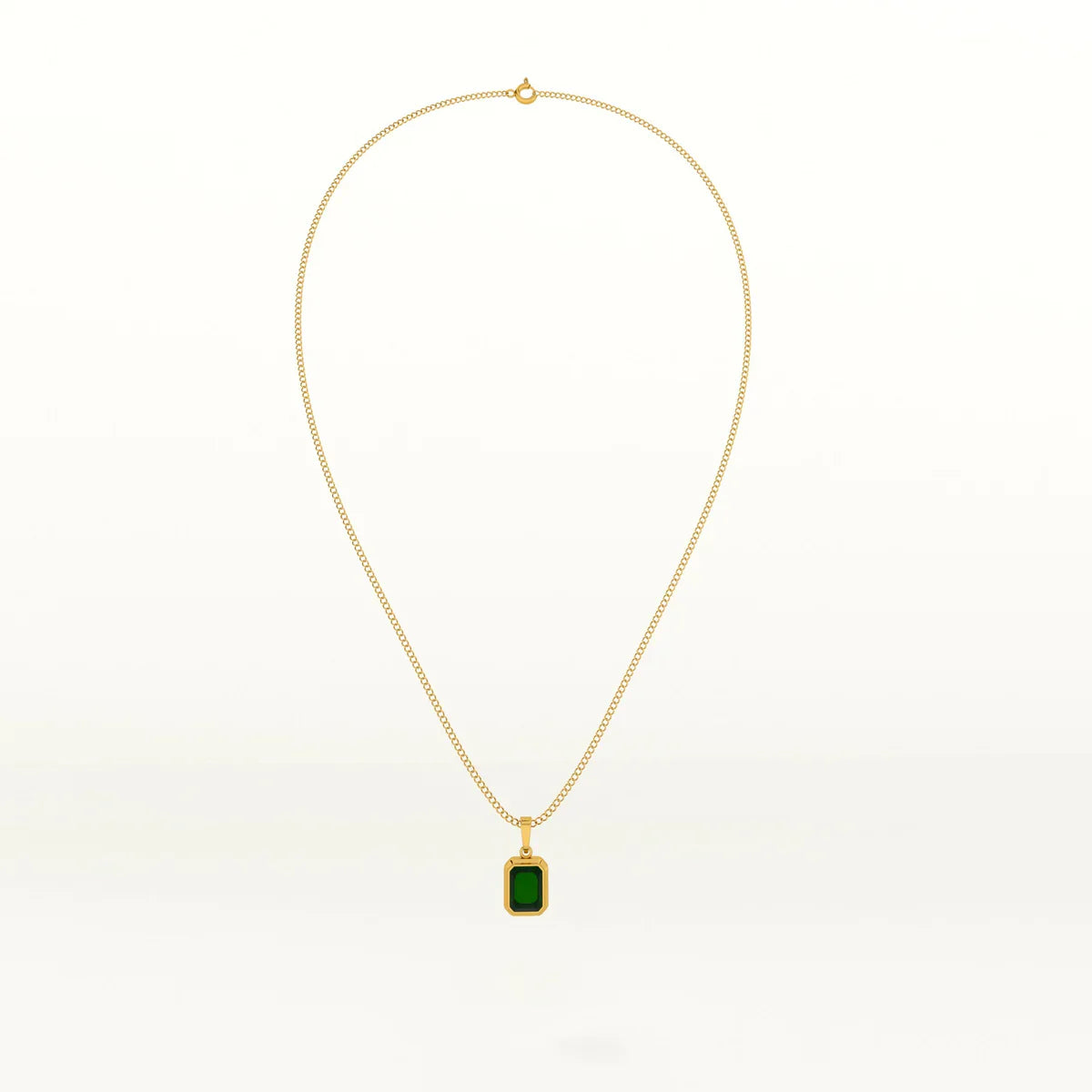 This exquisite necklace features a mesmerizing emerald gemstone, its verdant green brilliance capturing the eye. The emerald is delicately set in a polished gold pendant and hangs gracefully from a shimmering gold chain.