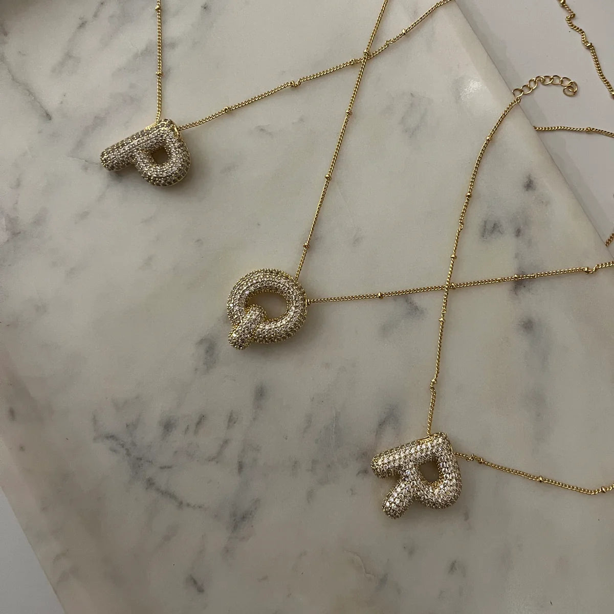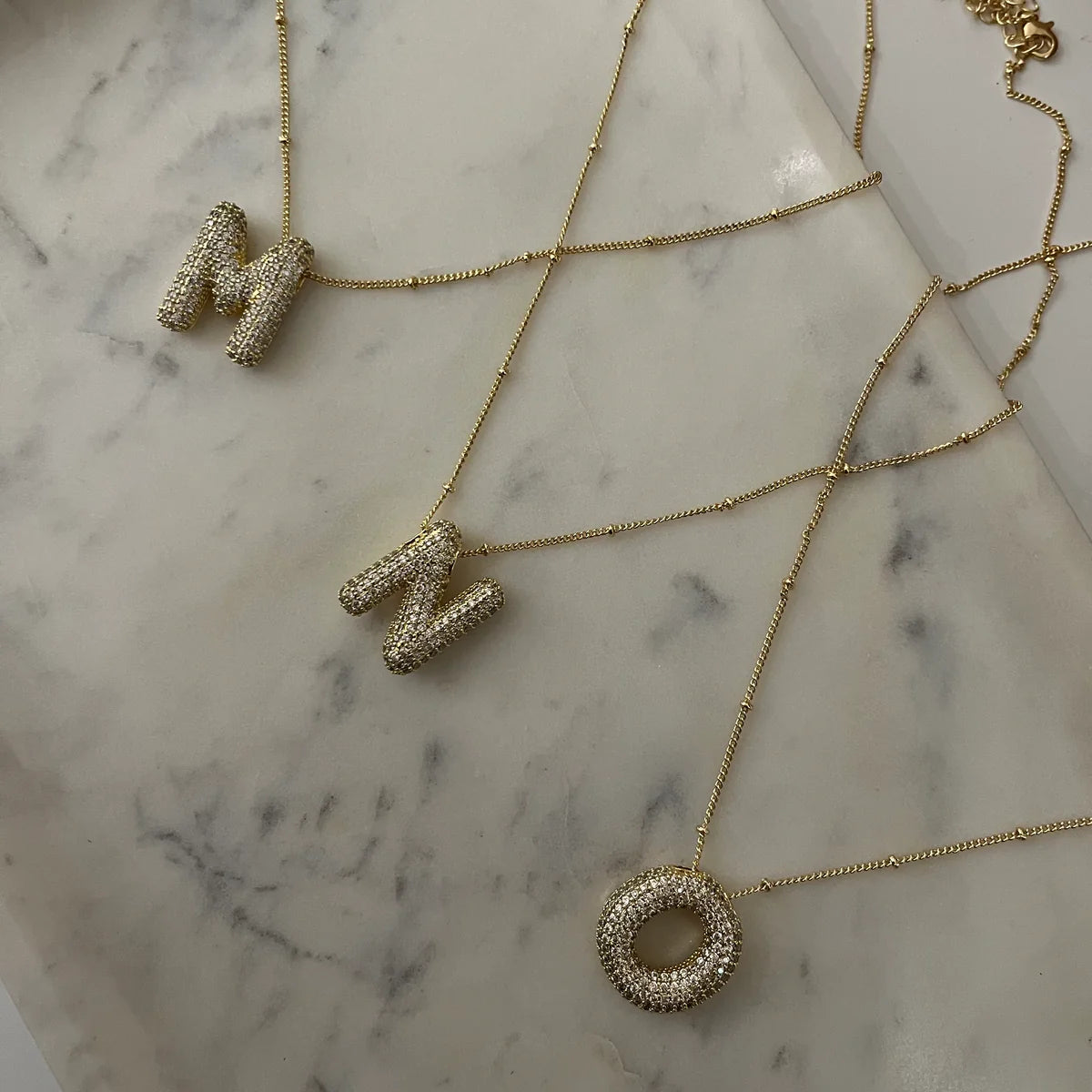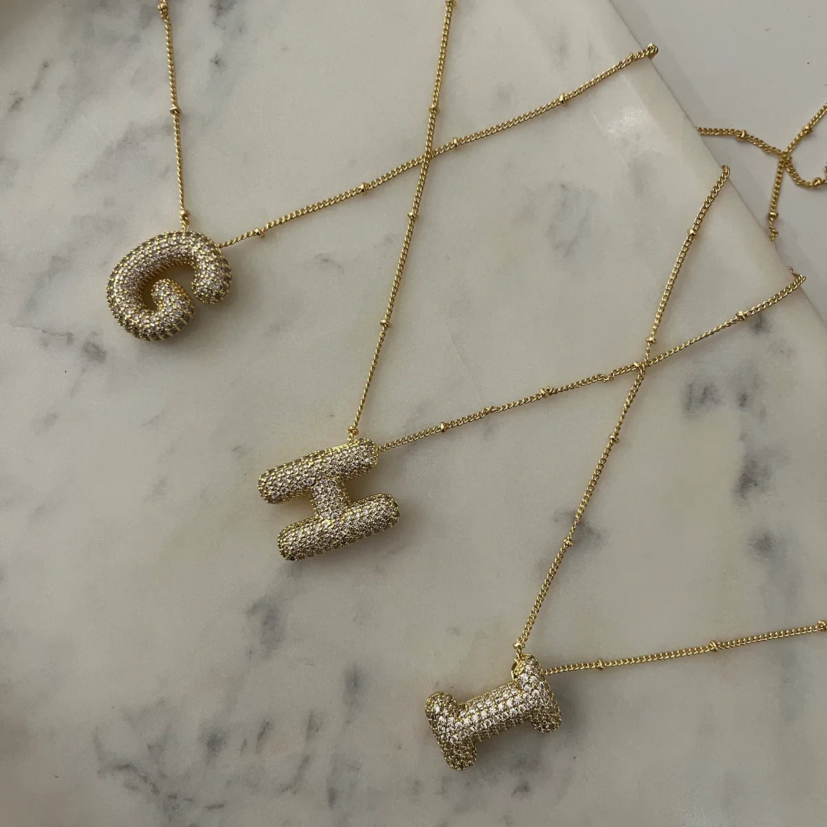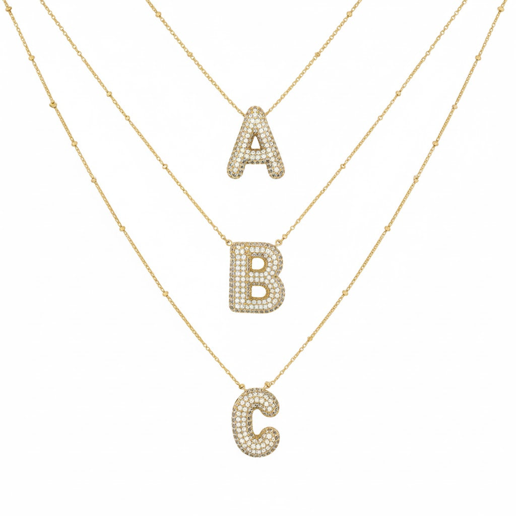 Diamond Studded Bubble Letters~ Necklace Make a bold statement with this contemporary necklace, featuring oversized bubble letter pendants adorned with diamond studs. Each letter catches light beautifully, creating dimension and sparkle that elevates everyday wear and special occasions alike. The premium craftsmanship ensures durability while maintaining a luxe aesthetic. Perfect for personalizing your style or gifting to someone who appreciates modern, eye-catching jewelry with timeless appeal.