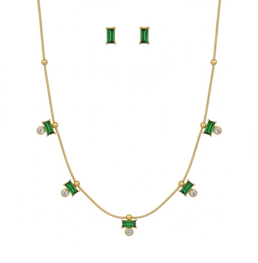 Emerald Ellie Necklace with Earrings Crafted for the discerning collector, this coordinated emerald set combines refined elegance with versatile styling. The necklace features a luminous emerald centerpiece suspended from a delicate chain, while matching earrings echo the same gemstone brilliance for a cohesive, polished look. Emerald's deep, sophisticated green hue complements warm and cool skin tones alike, making this set a timeless investment piece. Perfect for elevating everyday wear or anchoring an evening ensemble, the Emerald Ellie delivers understated luxury with enduring appeal.