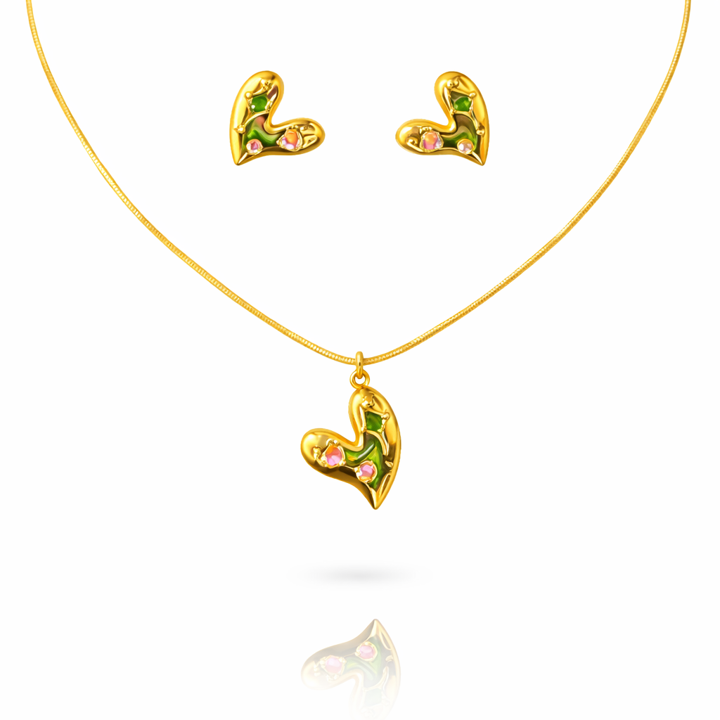 Delicate heart pendant necklace paired with matching earrings, crafted to capture light with colorful star accents. This coordinated set combines understated elegance with modern design, perfect for layering or wearing as a complete statement. Premium metal construction ensures lasting wear, while the thoughtful pairing makes it an ideal gift or personal indulgence for those who appreciate refined jewelry with subtle personality.