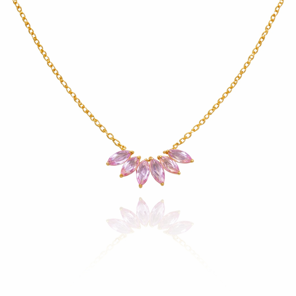 Pink Marque Cluster Necklace Delicate marquise-cut pink stones cluster together in this refined pendant, creating dimensional depth and light-catching brilliance. Suspended from a graceful chain, the design balances understated elegance with striking visual impact—ideal for layering or wearing as a standalone statement piece. Crafted with premium metalwork and gemstone accents, this necklace transitions seamlessly from day to evening wear, offering versatile sophistication for the discerning collector.