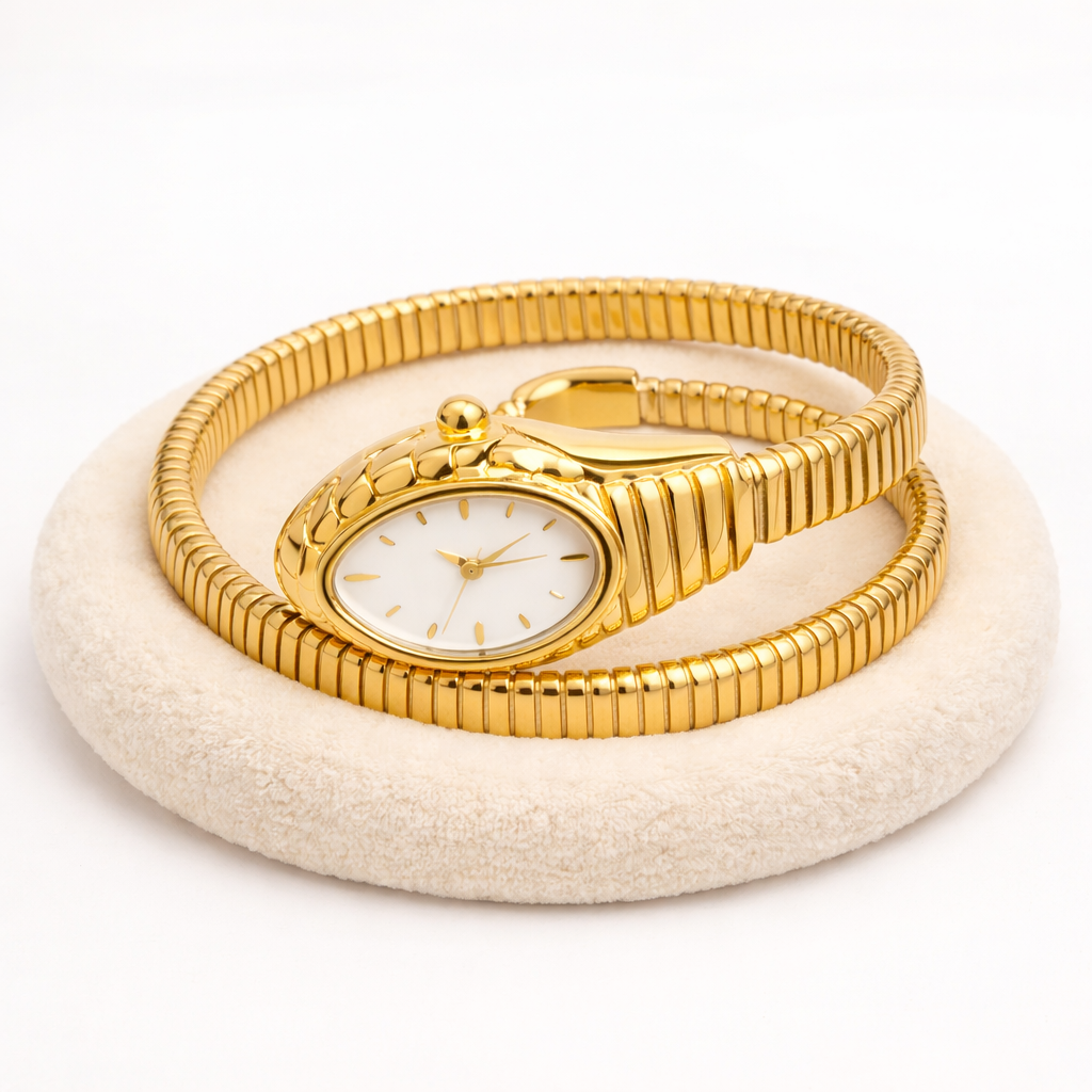 # Serpenti d'Or – White Snake Head Bangle Watch Iconic serpent design meets haute horlogerie in this striking bangle watch. The sculptural snake head crowns a seamless white metal bracelet, delivering both architectural presence and refined timekeeping. Engineered for the discerning collector who values statement jewelry that transcends occasion—equally at home layered with fine pieces or worn as a singular focal point. Precision movement housed within an instantly recognizable silhouette that commands attention without compromise on wearability or craftsmanship.