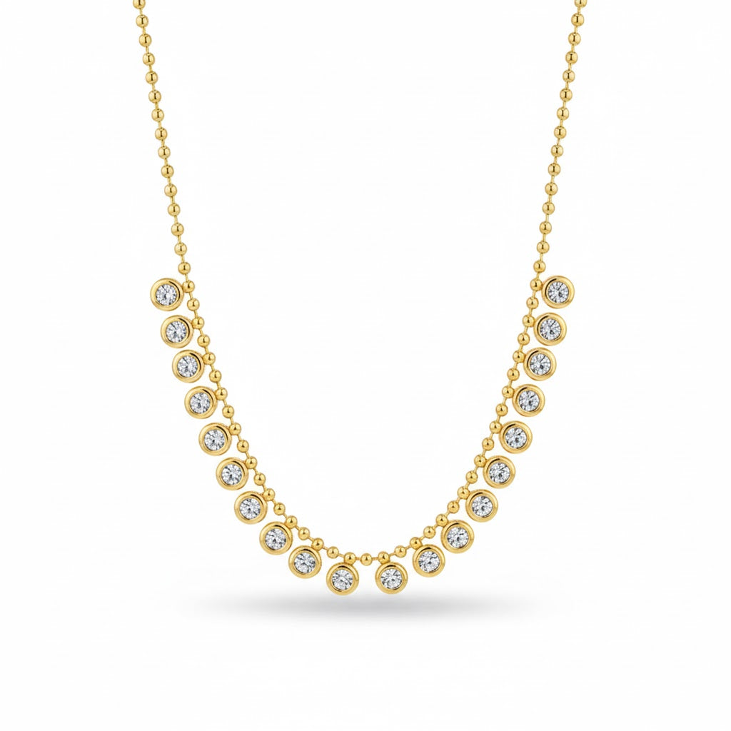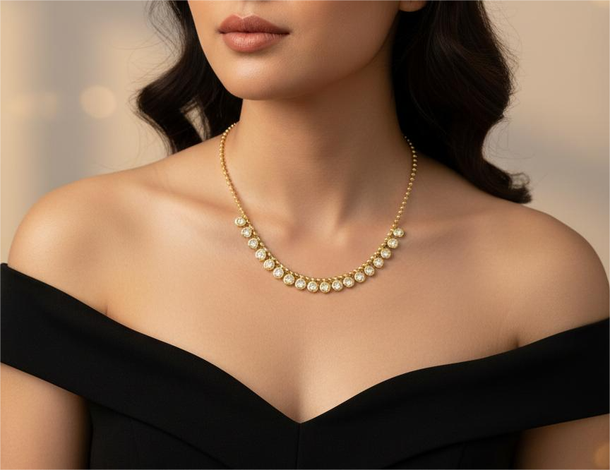 A sophisticated collar necklace that frames the neckline with refined elegance. This piece features a structured design that sits close to the neck, creating a polished, statement-making silhouette. Perfect for elevating both formal occasions and elevated everyday wear, it combines timeless appeal with contemporary styling versatility. The carefully crafted construction ensures comfortable wear throughout the day while maintaining its distinctive presence.